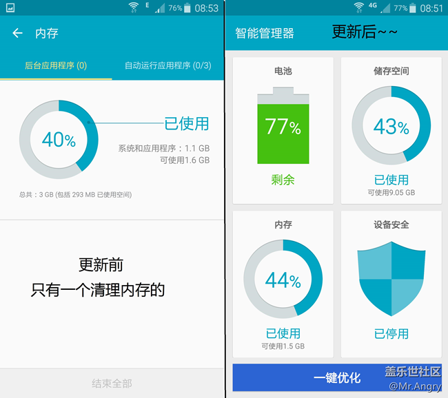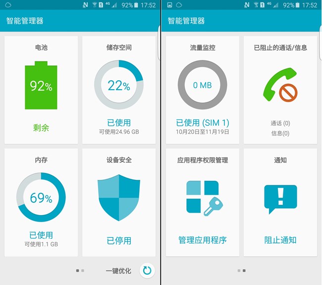更新后運(yùn)行速度快了許多,程序加載的速度也有所提高。之前有傳說(shuō)類(lèi)似s6那樣的智能管理器不會(huì)下放到note4這個(gè)機(jī)子上,沒(méi)想到這次更新竟然增加了功能。