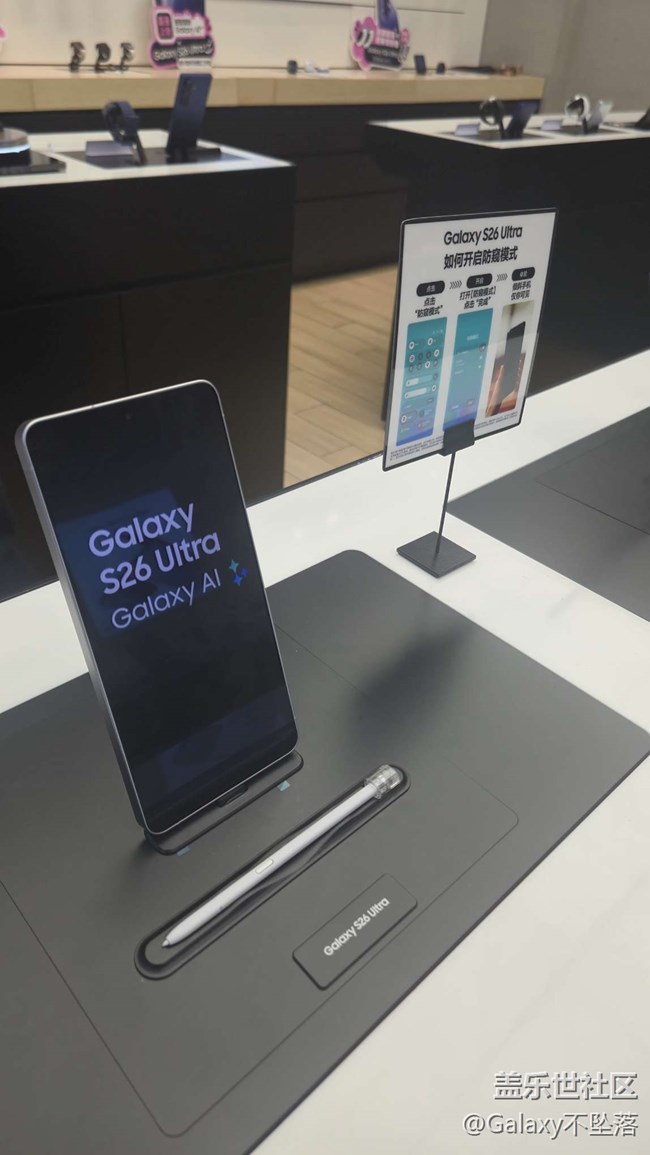 Privacy Display(隱私屏)?:這是Galaxy S26 Ultra最具辨識度的創(chuàng)新功能。它通過?在屏幕面板中集成微觀光柵結(jié)構(gòu)或兩種亞像素(窄視角與寬視角)?,用戶手動開啟后,系統(tǒng)會關(guān)閉寬視角亞像素,從而?有效限制側(cè)面可視角度,保護(hù)個人信息不被旁人窺視?。該功能支持?細(xì)顆粒度的自定義設(shè)置?,用戶可以僅對特定應(yīng)用程序、通知彈窗或密碼輸入?yún)^(qū)域啟用隱私屏,實現(xiàn)了靈活的場景化隱私保護(hù)。實測顯示,開啟標(biāo)準(zhǔn)隱私模式后屏幕側(cè)面仍能大致看清內(nèi)容,而極致模式則能提供最高級別的隱私性。??