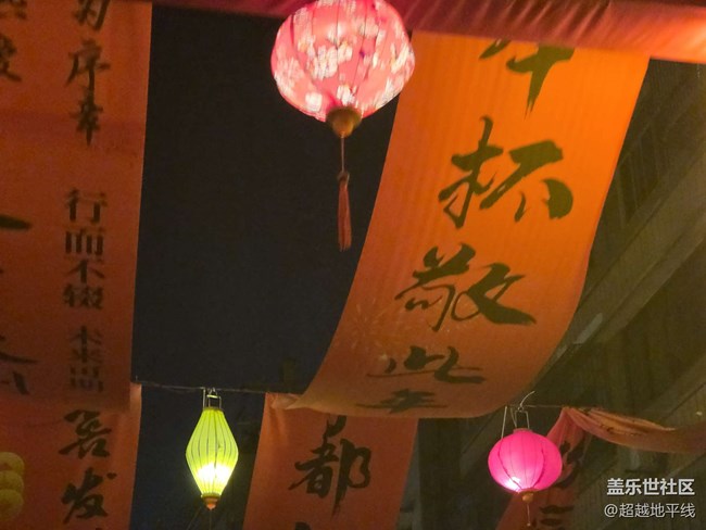 橙紅條幅在風(fēng)里輕晃,粉紅燈籠與暖黃竹編燈次第亮起。