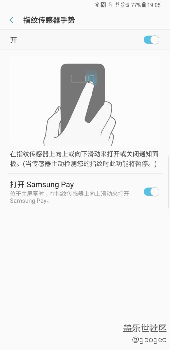 打開指紋傳感器手勢(shì)后,按照設(shè)置中的提示,手指向下滑動(dòng)打開通知面板,向上滑動(dòng)則打開samsung pay,前幾天還正常,可今天相反,變成了向下滑動(dòng)打開samsung pay,向上滑動(dòng)打開通知面板,重復(fù)設(shè)置幾次都如此,怪異。
