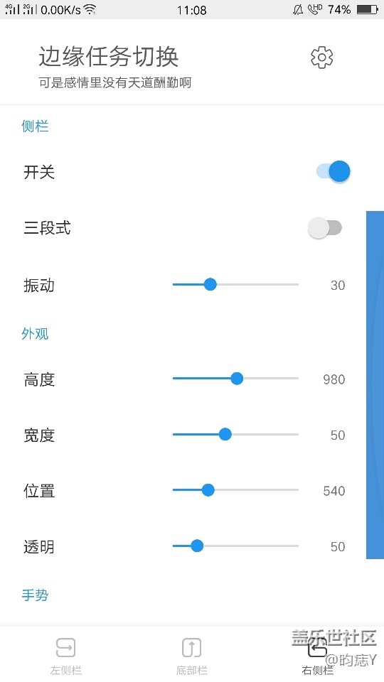 里面還有很多神奇小功能,支持側(cè)欄白名單放行一些全屏 App、二次滑動(dòng)確認(rèn)防誤觸、甚至還有跳過(guò)開(kāi)平廣告,喝水、天氣提醒等。