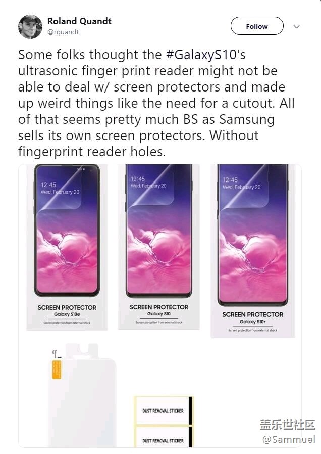 美國時間2月18日,Twitter知名爆料達(dá)人Roland Quandt曝光了三星官方為S10系列機型準(zhǔn)備的屏幕保護(hù)膜。根據(jù)曝光的圖片,三星S10系列的保護(hù)膜并沒有為屏幕指紋區(qū)域留有開孔,也就意味著貼保護(hù)膜并不影響S10系列機型屏幕指紋使用。