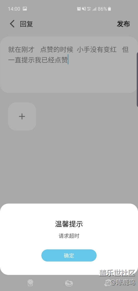 剛才先是點(diǎn)贊帖子,然后小手的圖標(biāo)沒有變紅,卻提示已經(jīng)點(diǎn)贊過。然后我回復(fù)帖子,一直提示請求超時(shí)   但退出來發(fā)現(xiàn)已經(jīng)回復(fù)好幾條了…………