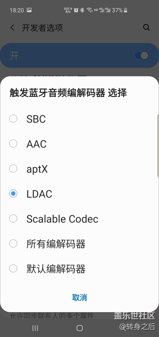 4月11號(hào)京東無(wú)貨,問(wèn)了專賣店說(shuō)有貨,過(guò)去試聽,居然說(shuō)被店長(zhǎng)帶出去了,原本抱著觀望的想法的,只能付款。帶上去一聽,音質(zhì)很一般啊,還不如那個(gè)自帶的akg,但是環(huán)境音一打開,發(fā)現(xiàn)效果好,邊上人說(shuō)話都聽的清楚。慢慢使用了幾天,發(fā)現(xiàn)過(guò)一次斷連,放進(jìn)盒子拿出來(lái)又好了,關(guān)于音質(zhì)問(wèn)題,建議大家先進(jìn)入設(shè)置-藍(lán)牙,把雙藍(lán)牙功能關(guān)閉,然后進(jìn)入設(shè)置進(jìn)入開發(fā)者選項(xiàng)(設(shè)置-關(guān)于手機(jī)-軟件信息-編譯編號(hào),點(diǎn)擊5-8下)找到藍(lán)牙音頻編解碼器選到LDAC或者Scalable codec(請(qǐng)問(wèn)大神這兩個(gè)選項(xiàng)有什么區(qū)別?百度上也查不出來(lái))