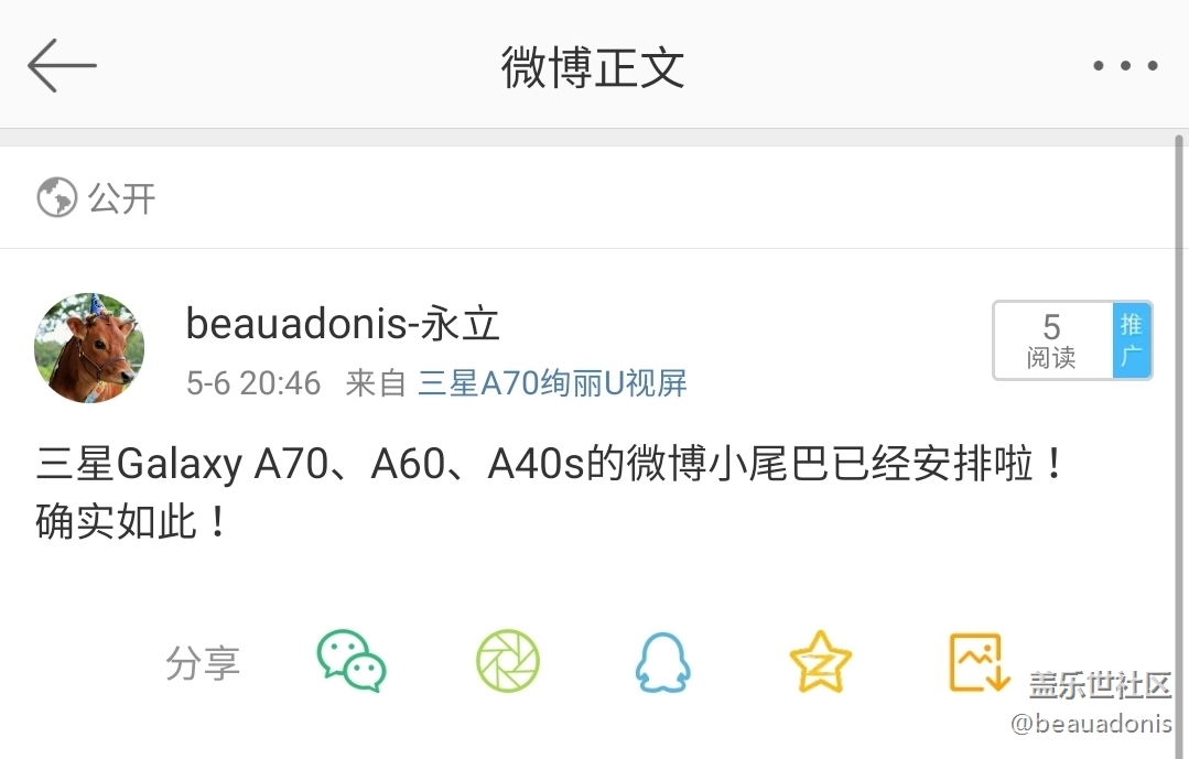 帖子名稱 三星Galaxy A70 微博尾巴已經(jīng)有了!