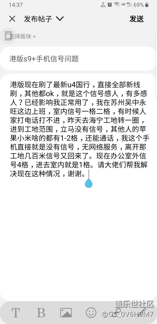 港版現(xiàn)在刷了最新u4國行,直接全部新線刷,其他都ok,就是這個信號感人,有多感人?已經(jīng)影響我正常用了,我在蘇州吳中永旺這邊上班,用的是移動4g,室內信號一格二格,有時候人家打電話打不進,昨天去海寧工地轉一圈,進到工地范圍,立馬沒有信號,其他人的蘋果小米啥的都有1-2格,還能通話,我這個手機直接就是沒有信號,無網(wǎng)絡服務,離開那工地幾百米信號又回來了?,F(xiàn)在辦公室外信號4格,進去室內就是1格。請大佬們幫我解決現(xiàn)在這種情況,謝謝。我覺得是不是s9接受信號的能力差啊?