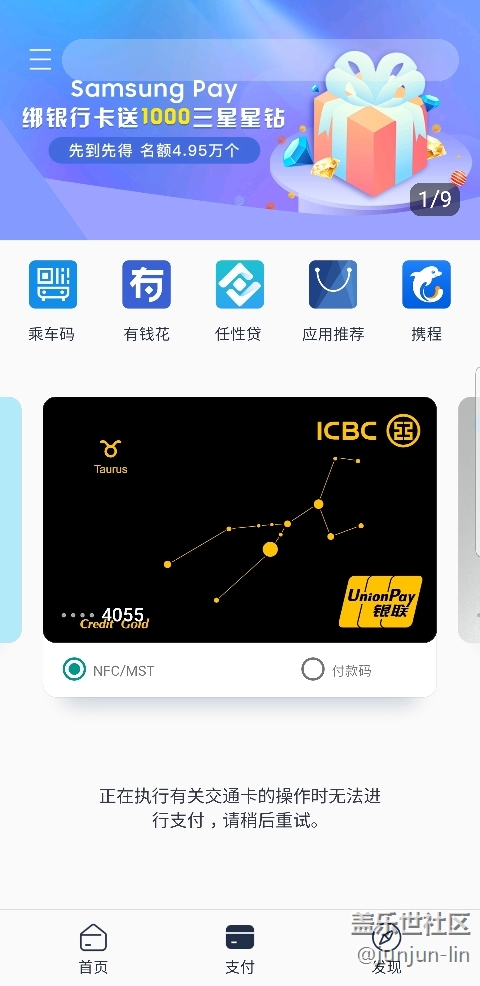 這個是什么情況啊?三星pay自從開了交通卡以后,原來用三星pay信用卡購物消費,現(xiàn)在不能用了?提示正在執(zhí)行交通卡操作時無法進行支付,提示如圖,這個是bug還是只有我這種情況?求大神幫忙