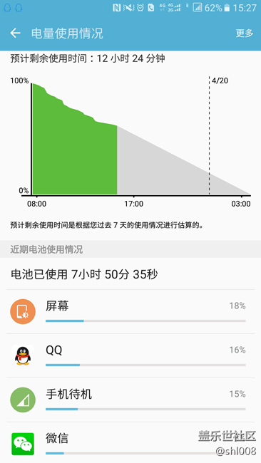 還是按照往常那么用的,升級(jí)6.0的時(shí)候是雙清的,剛升級(jí)完也沒事,就最近一周開始發(fā)現(xiàn)耗電特別嚴(yán)重,截至目前,亮屏?xí)r間累計(jì)1小時(shí)左右,往常的話這個(gè)時(shí)間點(diǎn)電量應(yīng)該剩余最少75%,不僅如此,為什么待機(jī)也耗這么多電呢