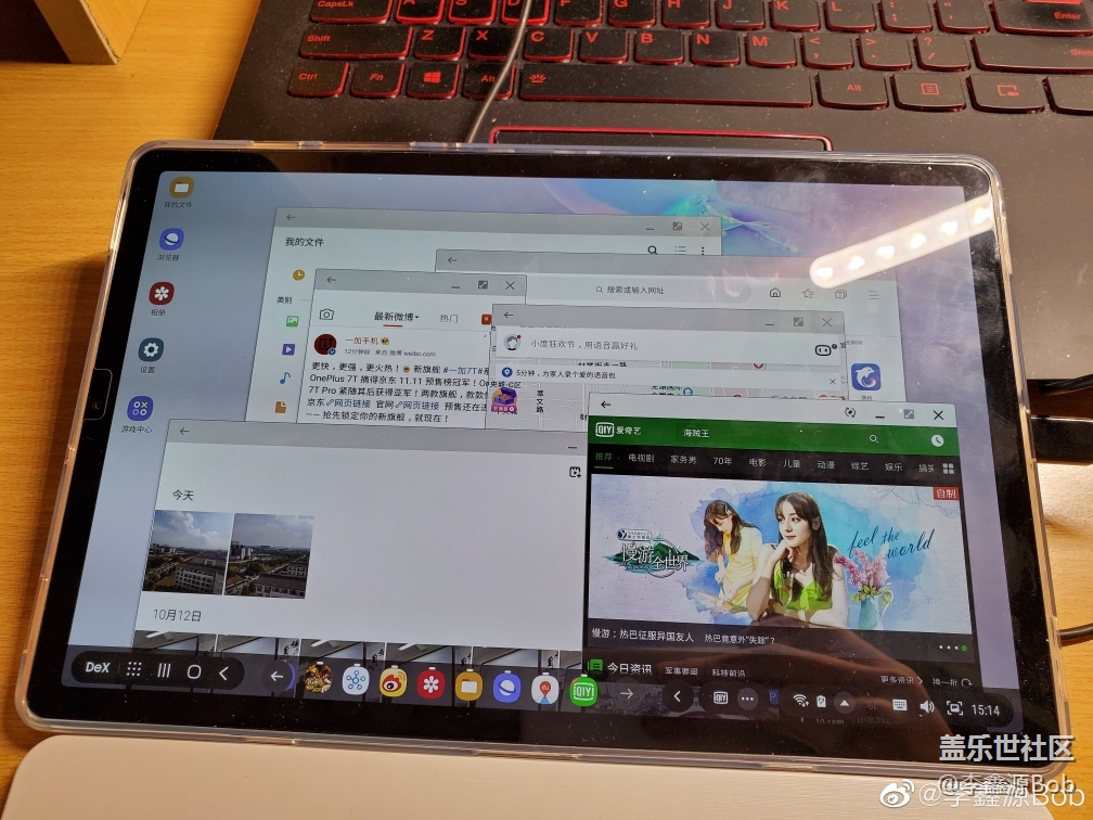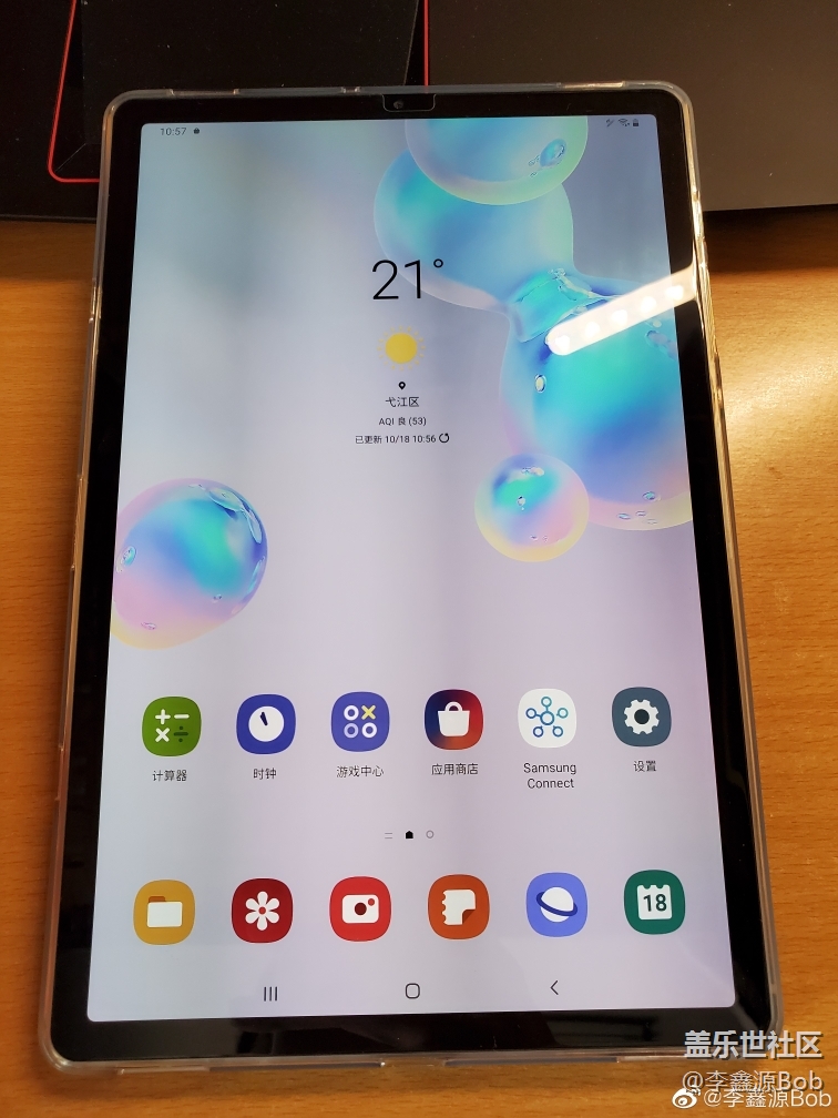 。首先說說優(yōu)勢。Tab S6上手第一感覺就是輕薄,上手完S6之后再去玩室友的iPad Pro,重量差距極為明顯。外觀上,窄邊框設(shè)計視覺沖擊力明顯,16:10的屏幕比例可以比較好的兼容手機應(yīng)用(算是一定程度上緩解了安卓平板軟件生態(tài)環(huán)境差的問題),我買的天際藍上手略有點發(fā)灰,個人覺得沒有渲染圖好看。作為全球首款支持HDR10 的平板電腦,出色的屏幕素質(zhì)是Tab S6的特色,屏幕通透,色彩絢麗,體驗相當棒(之前有體驗過華為M6,可以說這兩款的屏幕不是一個量級的,差距明顯)。外放上,AKG調(diào)教的四揚聲器不僅僅立體環(huán)繞聲,音質(zhì)也相當不錯,并且支持杜比全景聲。拍照方面,我對于平板拍照的需求就是能掃碼就行,Tab S6的雙攝像頭支持超廣角,提高了攝像頭的可玩性,不過沒有閃光燈算是一個小缺憾。(圖八為主攝樣張,圖九為超廣角樣張)。Samsung Dex可謂三星平板的一大特色,實際體驗下來,應(yīng)用開啟數(shù)量比較可觀,可以滿足輕辦公的需求,自帶的微軟office 軟件搭配物理鍵盤還是有一定的生產(chǎn)力,如果說在旅途上需要處理一些文檔工作還是相當可以的。解鎖方式,Tab S6擁有光學(xué)屏幕指紋模塊,實際體驗,比我的Note10 快……優(yōu)點說完了,下面說說槽點(這我就有的說了)。一,三星平板沒有息屏顯示,然后S6還采用了屏幕指紋解鎖,息屏狀態(tài)下解鎖體驗相當?shù)牟?。。。。。二,作為一款影音平板?.5mm耳機接口竟然沒有?!三,軟件生態(tài)確實是差,其實我要求不高,能用就行(就是iPad也一大把不能橫屏的軟件,有的軟件就是手機軟件,然而iPad的比例又不協(xié)調(diào),效果極差。還有一些軟件不兼容,索性大黑邊,那酸爽。。。。。安卓平板因屏幕比例和手機類似,手機軟件基本都能兼容),最痛苦的是QQ微信支付寶,軟件沒有給平板端做適配,平板和手機只能二選一,令人自閉(最后我找到了一個QQ HD版,雖然不如iPad端的,但勉強能用,重點是能和手機同時連接,微信支付寶還是無法解決)。四,Tab S6仍然是萬年15w快充。。。。。無語。。。。。自閉。。。。。最后總結(jié)一下,Tab S6是一款相當出色的影音平板,但除了強大的影音以外,也有著相當不錯的生產(chǎn)力,可以說是今年安卓平板的翹楚之作。