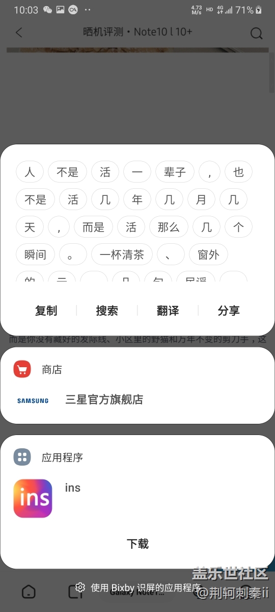 One ui的優(yōu)點(diǎn)在之前的文章中已經(jīng)說(shuō)過(guò)很多了,在A90 5G中,one ui添加了新功能-Bixby識(shí)屏。長(zhǎng)按屏幕即可識(shí)別出屏幕的內(nèi)容,可以很方便的復(fù)制,搜索,翻譯,分享文字內(nèi)容。而且還會(huì)根據(jù)內(nèi)容來(lái)推薦app以及網(wǎng)頁(yè)中的商品,十分方便。