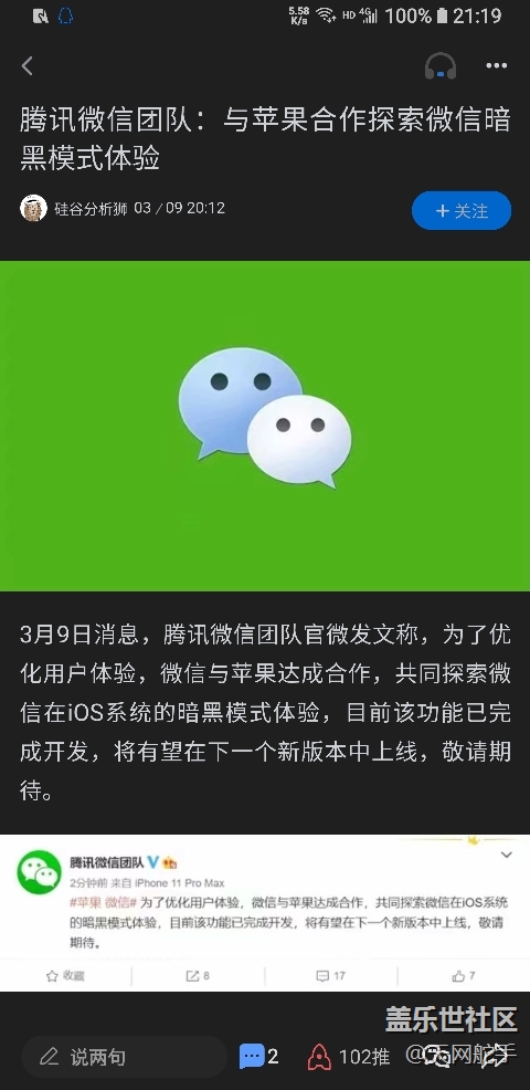 微信官方回復暗黑模式。 圖片
