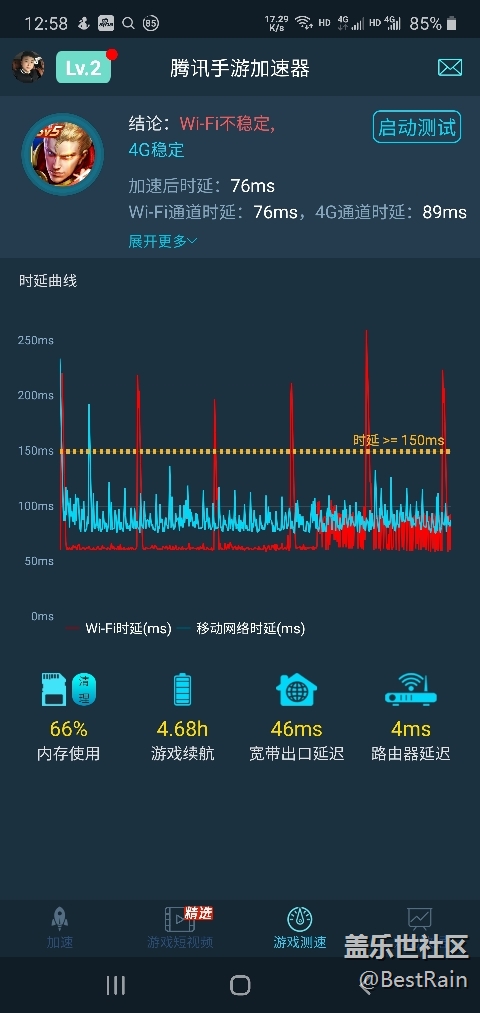懷著探知真理的心,也是對三星執(zhí)著,確實喜歡三星屏幕,三星界面,但一如既往這種簡單毛病煩多了,只有轉(zhuǎn)到華為或者割肉轉(zhuǎn)蘋果了,無奈。言歸正傳,今天到朋友的三星店進(jìn)行了一輪測試,機(jī)型為note10 ,s20,s20 ,5G頻段WiFi完全正常,但是2.4G(稱之為穿墻頻段,也是老WiFi路由器常用頻段)全部斷流,也就是延時,下載文件感覺不出來,但是游戲時候會有ms也就是ping值顯示,以及實時反饋,所以大家會有感受。測試工具為騰訊手游加速器。