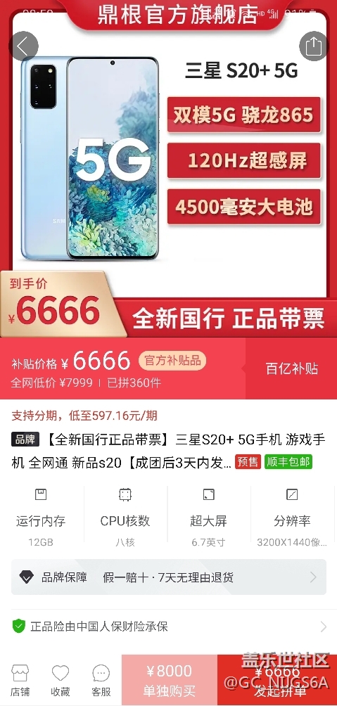 S20+在拼多多上購買有補(bǔ)貼,到手才6666 圖片