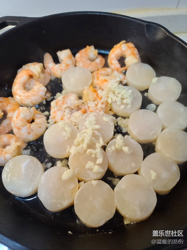 面快煮好時(shí)另起鍋,放橄欖油,放入蝦,一面變紅后,翻面時(shí)加入帶子