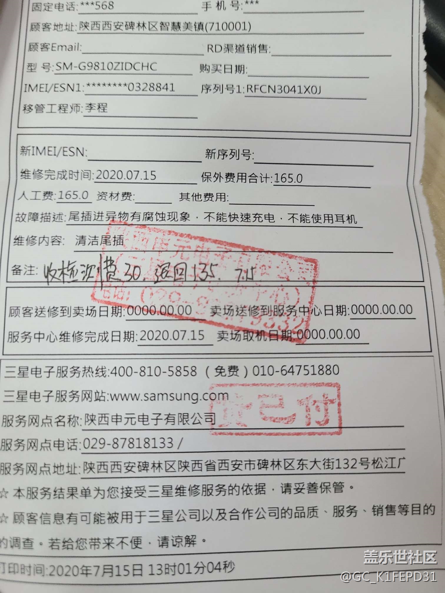 工程師給我說人為原因造成的需要清理充電口收費(fèi)165,注意這個(gè)165