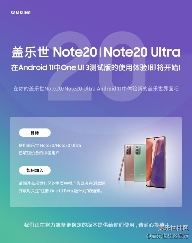 - 三星Galaxy手機用戶 您好,非常高興的告訴大家,關(guān)于Galaxy Note20|Note20 Ultra用戶在Android11中One UI 3測試版的使用體驗即將開始(預(yù)計11月中下旬進行)具體測試日期,請持續(xù)關(guān)注“三星蓋樂世社區(qū)”我們將第一時間在此公布相關(guān)信息。*參與本次測試需將“蓋樂世社區(qū)”APP升級到最新版本,使用舊版本進行報名將無法正常參與測試。 為了我們的版本能夠讓用戶得到更好的體驗,我們希望得到您關(guān)于Android 11操作系統(tǒng)界面的反饋。您可以安裝One UI測試版,廣泛地使用測試版本功能,希望您能從中體驗到快樂,然后讓我們了解您對該版本的性能、穩(wěn)定性和可用性的看法