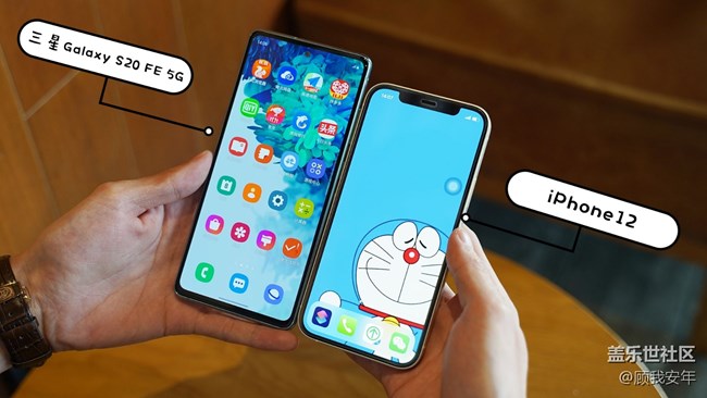 - 三星Galaxy S20 FE 5G和iPhone 12都是手機圈的網紅產品,兩款產品都是當下比較熱門的產品。最近我入手三星Galaxy S20 FE 5G,幾乎同一時間朋友又入手了iPhone 12,我就順便拿來一起對比一番,就當給那些在考慮兩款產品左右為難的朋友一些建議,有需要的朋友就參考一下咯。屏幕方面,三星Galaxy S20 FE 5G采用的6.5英寸屏幕,iPhone 12采用的是6.1英寸屏幕,很明顯,三星Galaxy S20 FE 5G比iPhone 12的屏幕「大」。iPhone 12采用的劉海屏,三星Galaxy S20 FE 5G則是采用了屏下開孔技術,這里我真想吐槽一下