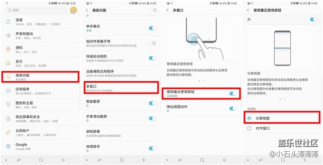 - 【你不知道的蓋樂世18】上一期小石頭和大家一起來了解了一下蓋樂世S9系列如何在它5.8(圓角5.6)/6.2(圓角6.1)英寸Super AMOLED屏幕(屏幕比例率先采用18.5:9)使用彈出視圖 ,大家有沒有學會呢?當然了在這樣一塊視野寬廣的屏幕上這一種方式確實還不夠。所以呢今天來告訴大家在三星蓋樂世S9 | S9+上面的另一種多窗口解決方案——分屏窗口。分屏窗口呢也一共提供了兩種方式+一種隱藏方式,分別是分屏及對齊窗口,下面呢就跟大家一一道來。類型I【分屏視圖】首先是打開這一功能依次點擊設(shè)置>>高級功能>>多窗口>>使用最近使用按鈕>>分屏