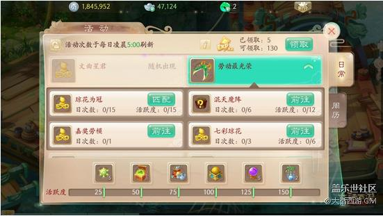 - 勞動(dòng)節(jié)來(lái)了,老鼠打算找家飯館好好吃頓小貓肉,老母雞打算怎么也得叼只黃鼠狼來(lái),麻雀準(zhǔn)備好好跟老鷹干一架。你呢?你想好干什么了嗎?此次大話(huà)西游手游放出全新的活動(dòng)玩法啦,豐富的經(jīng)驗(yàn)獎(jiǎng)勵(lì)和物品獎(jiǎng)勵(lì),再也不用做乏味的傳統(tǒng)周六日活動(dòng)了,快跟小葉子一起提前體驗(yàn)吧! 本次勞動(dòng)節(jié)活動(dòng)的主題為:勞動(dòng)最光榮,共有:瓊花為冠丶嘉獎(jiǎng)勞模丶七彩瓊花丶混天魔陣四大玩法。一、瓊花為冠 群英盛會(huì),宵小之徒趁著大殿繁忙之際,偷走了小伙伴的瓊花!小班們趕緊集合起來(lái)奪回物品,聽(tīng)說(shuō)他們?cè)诎坠巧?、方寸山、萬(wàn)壽山、大唐境內(nèi)、大塘邊境、北俱蘆洲出沒(méi)哦?! 救藬?shù)要求】三人以上組隊(duì)?! 镜燃?jí)要求】30級(jí)以上?! 净顒?dòng)時(shí)間】4月30號(hào)到