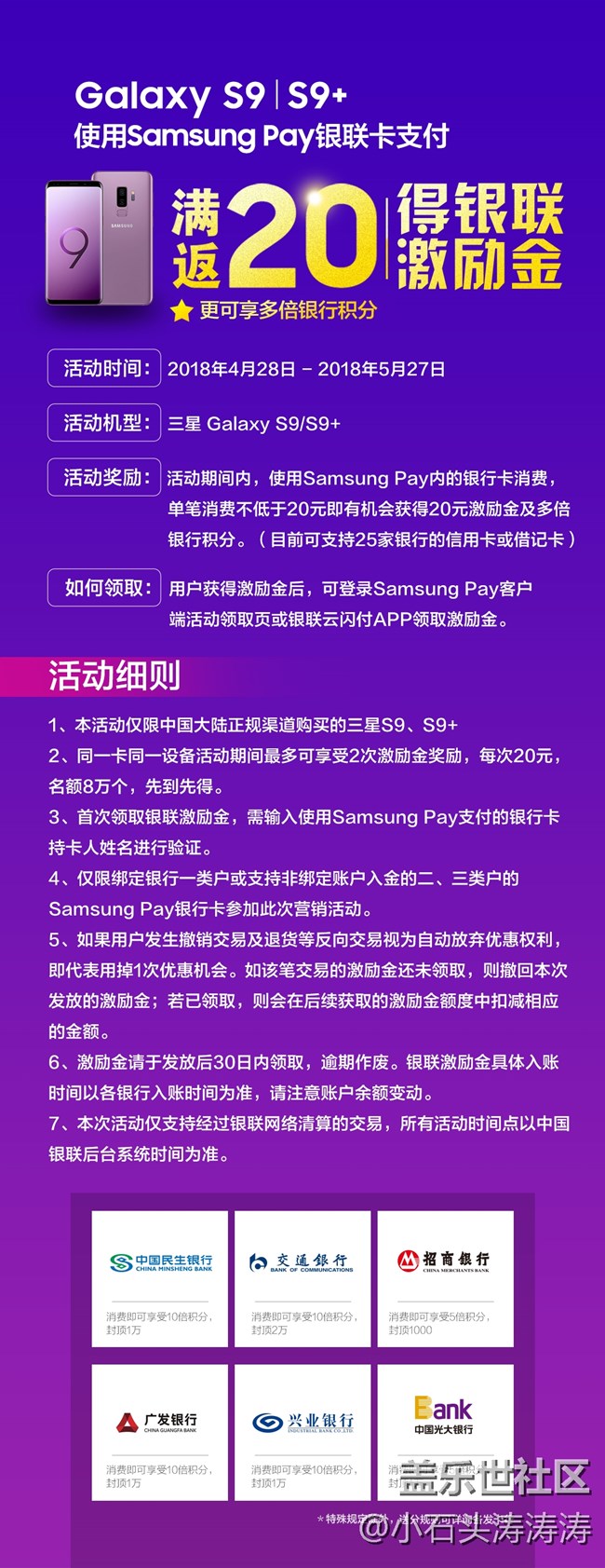 - 互聯(lián)網(wǎng)時代 “天上掉餡餅”的時刻總是那么多 這不 小石頭又發(fā)現(xiàn)了新的餡餅了下面是重點!三星Galaxy S9 | S9+用戶可以注意啦即日起至2018年5月27日 活動期間使用Samsung Pay內(nèi)的銀行卡消費單筆消費不低于20元即有機會獲得20元激勵金及多倍積分哦?。壳翱芍С?5家銀行的信用可和借記卡)話不多說 詳情見下圖~~(小石頭抓緊去薅羊毛了!)此外目前三星Galaxy S9 |S9+勃艮第紅版本正在火熱開賣多重好禮相贈+Samsung Pay銀聯(lián)激勵金咳咳 是時候出手了<點我了解購買詳情>