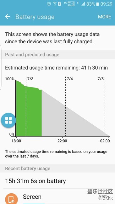 - 自從4月份買的S7到現(xiàn)在也用了快4個(gè)月了,開始電池還比較耐用,但自從更新之后耗電量就開始增加,尤其是這次PG2,實(shí)在無法忍受。看個(gè)網(wǎng)頁手機(jī)都會(huì)發(fā)熱,大概算了下3分鐘1%的掉(之前沒有過),待機(jī)一夜大概用15%電量。以為是中了病毒(因?yàn)橹包c(diǎn)開過假紅包),就恢復(fù)出廠了。問題依然沒有解決,于是就開始找原因,電池耗電排行Android系統(tǒng)比屏幕耗電還高,明顯不正常。 什么一鍵優(yōu)化,后臺(tái)清理,自啟動(dòng)等一些常規(guī)方法都用過,就不說了。既然是系統(tǒng)耗電,那就在設(shè)置里找找關(guān)于系統(tǒng)設(shè)置的問題,終于找到了原因,先上圖坡度已明顯放緩,如果純待機(jī)的話估計(jì)1小時(shí)掉1%沒問題,我的息屏提醒開著,而且沒有用省電