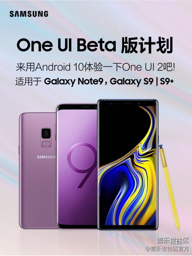 - 親愛的三星Galaxy S9 | S9+及Galaxy Note9用戶,您好:我們又見面了,新的蓋樂(lè)世界面和Android 10操作系統(tǒng)的測(cè)試版體驗(yàn)即將開始!為了我們的版本能夠讓用戶得到更好的體驗(yàn),我們希望得到您關(guān)于Android10操作系統(tǒng)界面的反饋。您可以安裝One UI 2測(cè)試版,廣泛地使用測(cè)試版本功能,希望您能從中體驗(yàn)到快樂(lè),然后讓我們了解您對(duì)該版本的性能、穩(wěn)定性和可用性的看法。 請(qǐng)注意,測(cè)試版版本僅提供給參與活動(dòng)的用戶。測(cè)試版版本并非正式版本,因此可能會(huì)導(dǎo)致一些故障。此外,部分功能也可能無(wú)法使用。 如果您擁有三星Galaxy S9 | S9+及Galaxy Note9 (已解鎖設(shè)備)