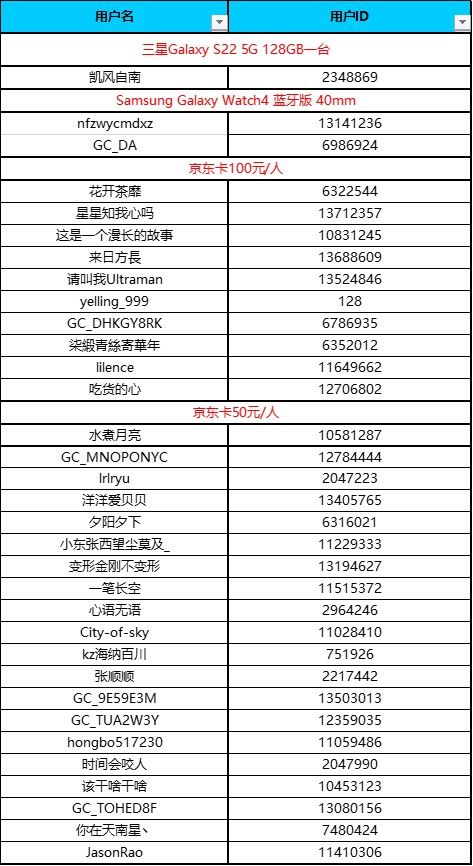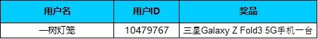 - 恭喜以下用戶(hù)獲得 三星Galaxy Z Fold3 5G手機(jī)一臺(tái)*請(qǐng)中獎(jiǎng)人將身份證正反面、收貨地址、姓名、電話(huà)等信息發(fā)送至keke.yan@cheilpengtai.com 郵箱中*實(shí)物獎(jiǎng)品將在收到信息后的5個(gè)工作日內(nèi)發(fā)出恭喜以下用戶(hù)獲得 京東卡100元/人*此獎(jiǎng)勵(lì)將在10-15個(gè)工作日內(nèi)發(fā)放,請(qǐng)?jiān)凇拔业亩Y品”處查看恭喜以下用戶(hù)的內(nèi)容獲得加精華獎(jiǎng)勵(lì) 1000星鉆/人*此獎(jiǎng)勵(lì)將在10-15個(gè)工作日內(nèi)發(fā)放,請(qǐng)?jiān)凇拔业亩Y品”處查看未抽中獎(jiǎng)且按活動(dòng)要求發(fā)帖用戶(hù) 獎(jiǎng)獲得 500星鉆/人*此獎(jiǎng)勵(lì)將在10-15個(gè)工作日內(nèi)發(fā)放,請(qǐng)?jiān)凇拔业亩Y品”處查看根據(jù)參賽要求,以下用戶(hù)為成功參與活動(dòng)并按活動(dòng)要求發(fā)帖用戶(hù)【參