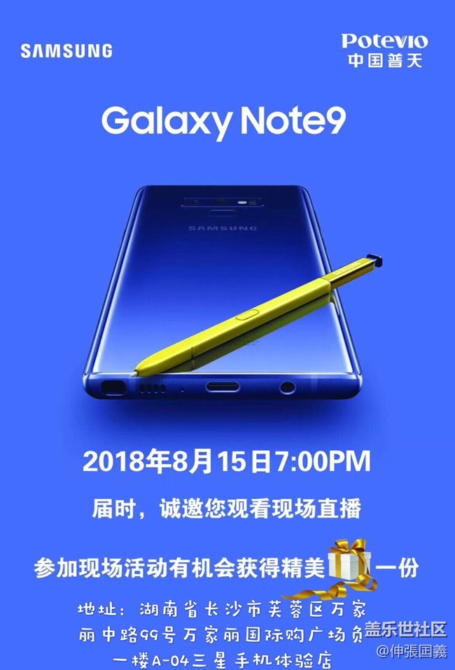 - 三星Galaxy N9為了給各位星粉們提供更近距離了解三星Galaxy N9的機(jī)會(huì)8月15日傍晚7點(diǎn)在長(zhǎng)沙市湘飛萬(wàn)家麗MALL體驗(yàn)店舉行線下星粉匯聚觀看N9發(fā)布會(huì)現(xiàn)場(chǎng)直播【活動(dòng)時(shí)間】活動(dòng)時(shí)間:2018年8月15日18:30~19:00(簽到)禮品~政策進(jìn)店禮:進(jìn)店即送三星定制款馬克杯抽獎(jiǎng)禮:電子秤。抽取5名預(yù)定疊加禮品:現(xiàn)場(chǎng)預(yù)定送無(wú)線座充或JBL藍(lán)牙音箱,二選一;無(wú)憂購(gòu)機(jī):招行信用卡用戶享12期免息分期、捷信/花唄/以舊換新19:00~19:10(真機(jī)體驗(yàn))19:10~19:30(產(chǎn)品介紹)19:30~20:30(觀看直播)20:30~20:40(抽獎(jiǎng)環(huán)節(jié))20:40~20:45(合影留念)【