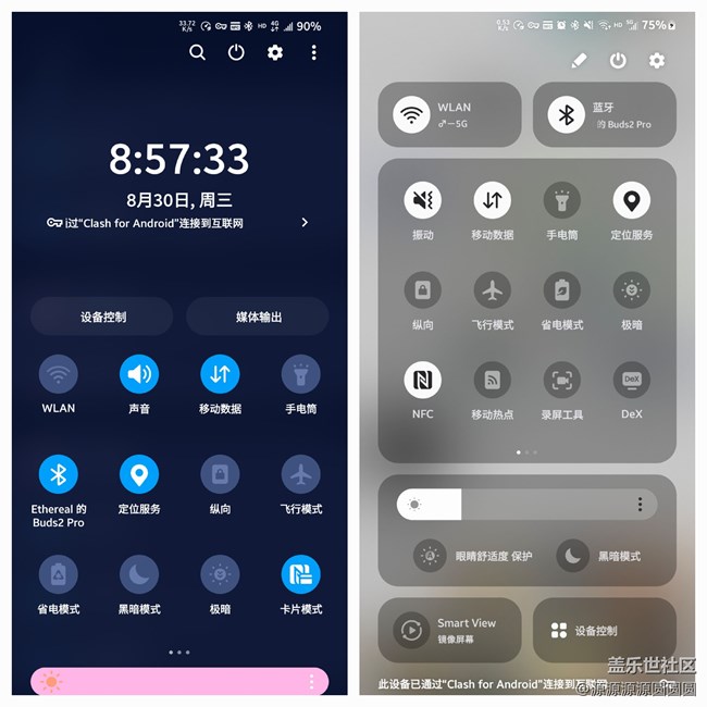 - 在經(jīng)過8月31日的一次推遲后, 9月4日下午1點(diǎn)30分,國行S23系列的One UI 6.0 beta測試組終于開始招募啦,我也是第一時間搶到名額來體驗(yàn)這次全新升級的系統(tǒng)。一、快捷面板One UI 6.0摒棄了之前的快捷面板設(shè)計(jì),相對于One UI 5.1的快捷面板,One UI 6.0采用了全新的按鈕布局,WLAN以及藍(lán)牙有了專屬獨(dú)立按鈕,黑暗模式以及眼部舒適度保護(hù)則移至亮度條下方,符合使用邏輯。而其他快捷設(shè)置按鈕則顯示在中間的可自定義區(qū)域。由于快捷面板的巨大改動,交互方式如果繼續(xù)采用之前二次下拉會顯得有一些不方便,我們可以在設(shè)置中開啟“快捷設(shè)置即使訪問”來實(shí)現(xiàn)更方便的操作。在音樂以及視頻播