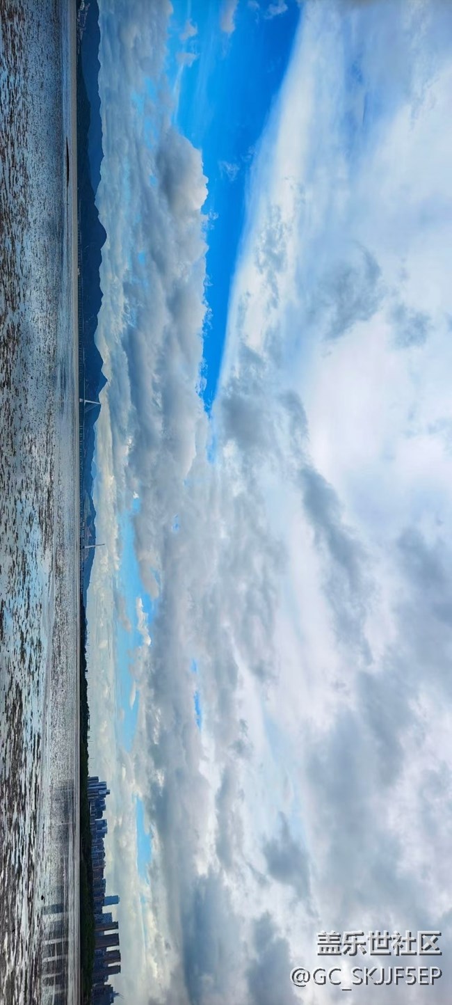- 在城市的喧囂與寧?kù)o間,總藏著天空寫下的詩(shī)。暮色中的江邊,高樓與云朵在水面鏡像,朦朧天色暈染出靜謐,城市的硬朗被揉進(jìn)柔軟波光。晴朗時(shí),海岸線旁,云朵在藍(lán)天肆意鋪展,遠(yuǎn)山作伴,建筑成了天地間的點(diǎn)綴,自然與城市的邊界,悄然消融。 工業(yè)區(qū)的碼頭,晚霞給云朵鑲上金邊,機(jī)械與自然奇妙共存,粗獷與柔美碰撞出獨(dú)特?zé)熁?。更?ài)極目遠(yuǎn)眺,林立高樓之上,云朵堆疊成山,遠(yuǎn)山在云海后若隱若現(xiàn),城市的鋼筋水泥,也成了觀云的畫框。 每一次抬頭,天空都在變換模樣,有時(shí)是水墨暈染的灰,有時(shí)是澄澈透亮的藍(lán),云朵或聚或散,或卷或舒。城市在天地間生長(zhǎng),天空用瞬息萬(wàn)變的云,回應(yīng)人間煙火。這些畫面,讓我懂得,忙碌的城市里,別錯(cuò)過(guò)抬