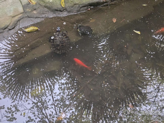 - 水池里的金魚和烏龜,看起來很可愛。