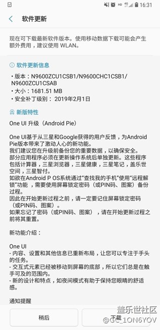 【2/17更新】 各位星粉朋友們 非常抱歉的告訴大家 原計(jì)劃今日(2月17日)進(jìn)行的三星Galaxy Note9 Android 9.0 的系統(tǒng)升級(jí)推送計(jì)劃 現(xiàn)變更為明日(2月18日)下午 開(kāi)始進(jìn)行升級(jí)推送 由于更新數(shù)量較大,屆時(shí)各位星粉朋友們將會(huì)陸續(xù)收到系統(tǒng)更新的推送通知,還請(qǐng)您耐心等待。 (若您在系統(tǒng)升級(jí)正式推送期間,還暫未收到系統(tǒng)升級(jí)的推送通知 還可嘗試在“系統(tǒng)設(shè)置”中點(diǎn)擊“手動(dòng)下載更新”嘗試系統(tǒng)升級(jí)。) 對(duì)于此給您帶來(lái)的不便我們深表歉意,感謝您們一直以來(lái)的理解與支持。
