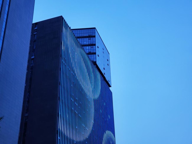我們以夜景拍攝為例查看三星Galaxy S10的拍攝實力,在傍晚十分,藍(lán)色天空和藍(lán)色燈光通過肉眼查看幾乎成為一體的狀態(tài)下我們可以看到三星Galaxy S10已經(jīng)將畫面的層次感清晰表達(dá),正面和側(cè)面的LED燈光可以清晰的看到每一個玻璃窗戶的位置。
