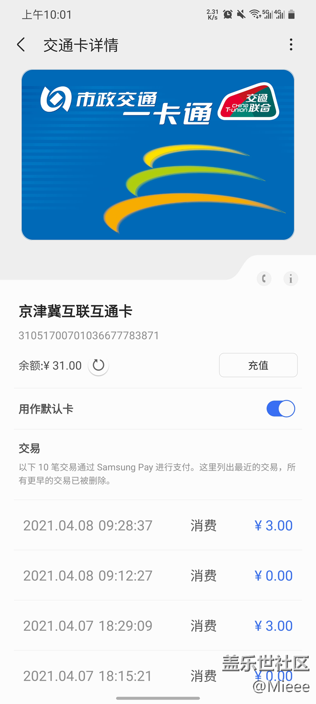 SAMSUNG Pay 里面交通卡開一張 京津冀互聯(lián)互通卡 ,支持成都地鐵,可以直接刷NFC?,F(xiàn)在不知道還有沒有送費(fèi)活動(dòng),可以看看,爽得很。