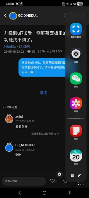 升級到ui7.0后,側屏幕面板里的截屏固定功能找不到了,