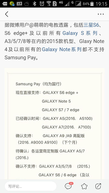 三星的說法是不支持mst功能,其實可以用NFC功能。