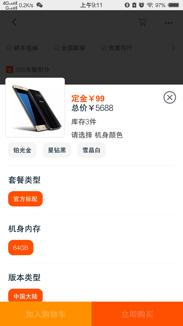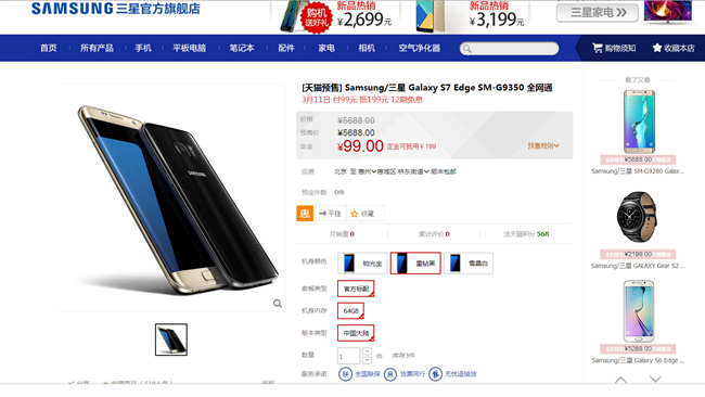 我看到了,S7 edge的總價(jià)是5688,99定金當(dāng)199用,那就只是優(yōu)惠了100,但是有個(gè)好消息,內(nèi)存標(biāo)的是64G!