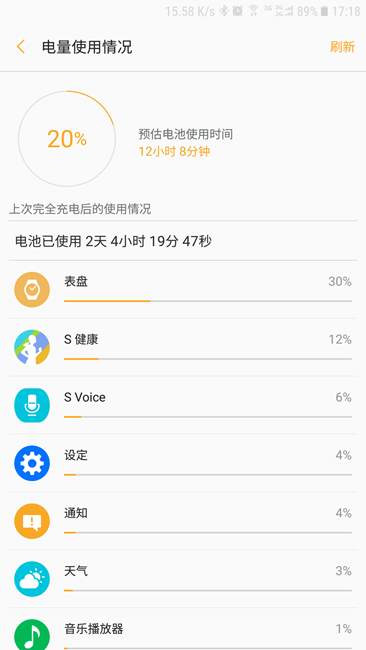 我的Gear S3剛開(kāi)箱充滿了電然后用到現(xiàn)在,也就是差不多50個(gè)小時(shí),目前電量還有20%。剛買來(lái)這一整子因?yàn)樾缕媸褂昧亢艽螅瑳](méi)想到還能扛這么久,很讓我滿意。