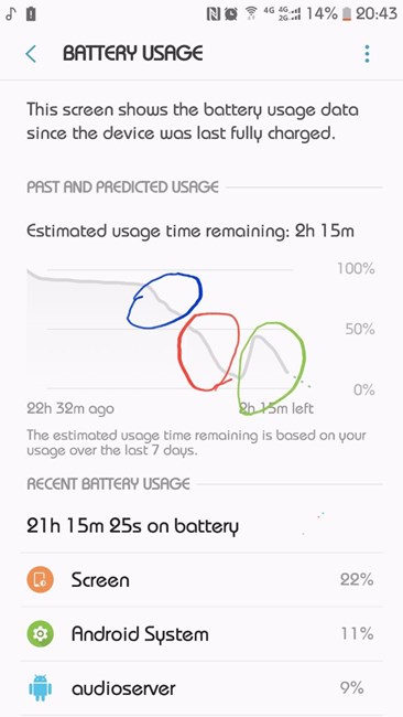 我還是上個(gè)圖吧,最開(kāi)始肯定是待機(jī)沒(méi)錯(cuò),藍(lán)圈是升級(jí)前亮屏使用,紅圈是升級(jí)后亮屏使用,明顯很陡,綠圈是充電后又使用,下降的部分也很陡,我沒(méi)必要*,我現(xiàn)在掉電也是飛快,等周末雙清試試吧