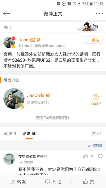 三星培訓師已微博表示國行統一UFS2.1內存,各位不用擔憂了。