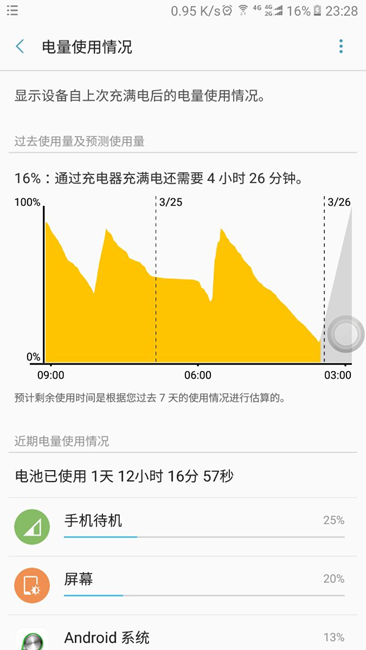 待機(jī)耗電很大,白天使用,微信和QQ信息較多,亮屏使用大約每小時(shí)10%的電,待機(jī)的耗電速度比亮屏略低。