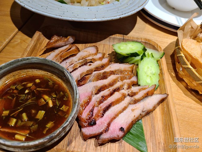 泰式經(jīng)典的豬頸肉非常軟嫩,看上去都是粉撲撲的,配上獨(dú)特的蘸料有很濃郁的香料味!