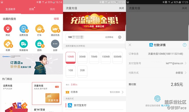 首頁有流量充值選線,選擇好充值檔位,點(diǎn)擊確定【S助手】自動(dòng)彈出支付寶支付界面,用三星Galaxy S7 edge指紋不到一秒就可快速支付!
