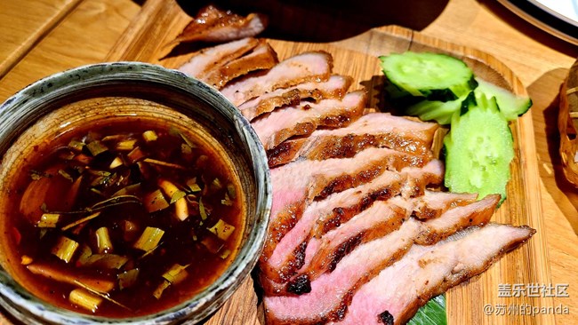 泰式經(jīng)典的豬頸肉非常軟嫩,看上去都是粉撲撲的,配上獨特的蘸料有很濃郁的香料酒味!