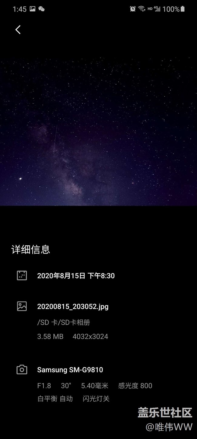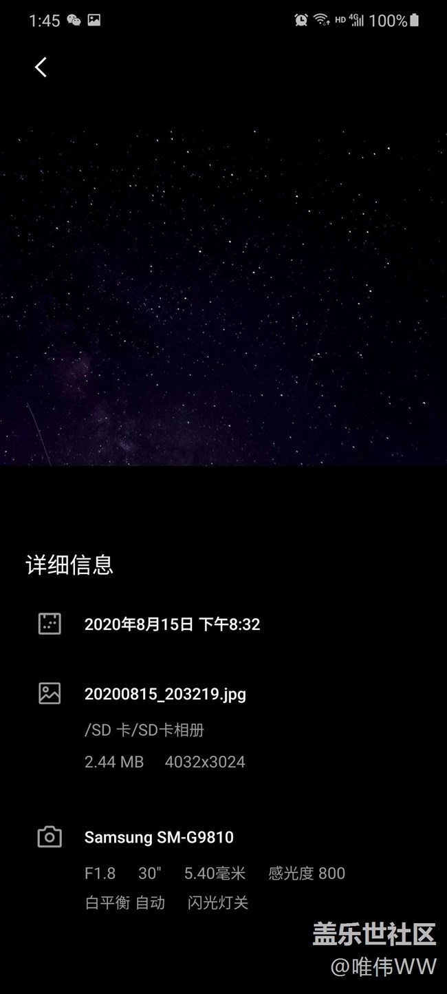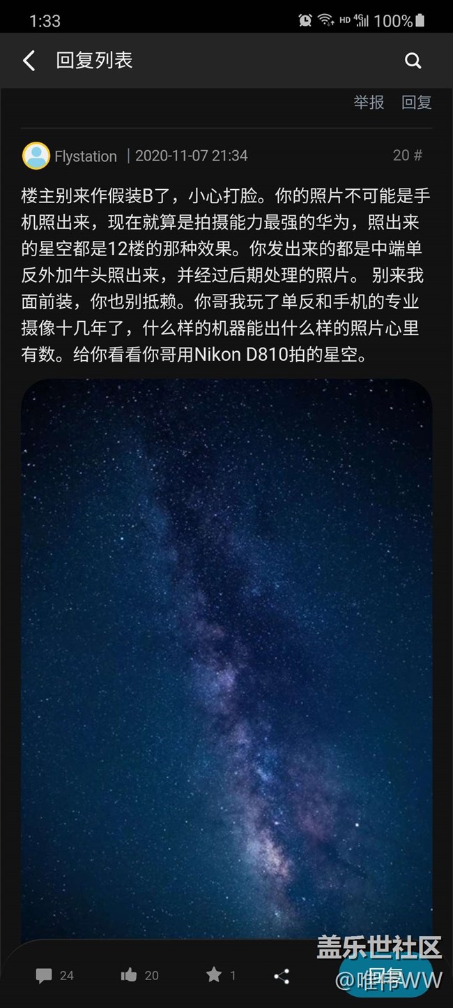 幾個月前在這發(fā)了張s20夜拍星星照,引來部分機(jī)友圍觀并留言,我回復(fù)了幾條并附上手機(jī)拍照設(shè)置參數(shù)和當(dāng)時拍照的環(huán)境后就沒再關(guān)注了,今天回頭看的讓人啼笑皆非的一幕,讓人又高興又無奈,高興的是他拿他的尼康相機(jī)和我的那張手機(jī)照片比且說差不多效果,無奈的是他比較以后得出結(jié)論我的照片也是相機(jī)拍的,呵呵,今天順便再多發(fā)幾張當(dāng)時一起拍的照片大家瞄瞄,說明一下因為設(shè)置的時間是30s,有的照片里有飛機(jī)飛過,飛機(jī)的燈光變成了一條線,當(dāng)時就是因為這些線就沒發(fā)出來了,圖后面我都會再截有參數(shù)的圖,最后附上那位說是相機(jī)的回復(fù)截
