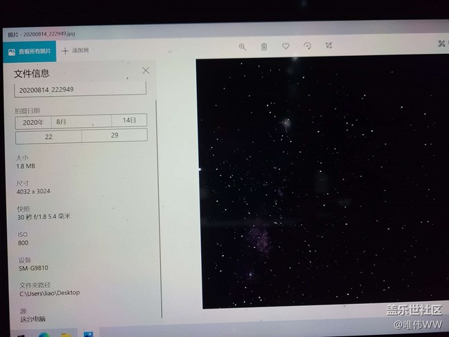 事情是這樣的,前兩個(gè)月在論壇發(fā)了個(gè)帖子傳了張s20夜拍星星照,一噴子上來就噴我造假,原因是他覺得我的照片和他單反拍的差不多,說s20不可能有這水平,昨天我新開個(gè)帖子加傳了幾張,他又跳出來噴我的照片是假的,參數(shù)圖是拼的,且出口成臟,還口出100萬賭我的圖是假的(具體看我前面兩個(gè)帖子),仔細(xì)想想他那估計(jì)就剩張嘴了,他的100w這輩子是不可能有的了,就把原圖發(fā)出來給大家個(gè)樂子看看吧,