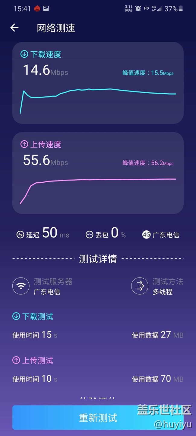 考慮到自動(dòng)切換會影響測試準(zhǔn)確度,所以關(guān)閉了網(wǎng)絡(luò)自動(dòng)切換,接下來會用電信app,安兔兔,和手機(jī)商城下載速度做一個(gè)實(shí)際的測試1.電信營業(yè)廳(開著5g網(wǎng)絡(luò)測試,卻顯示4g,不知道是軟件問題還是啥?)