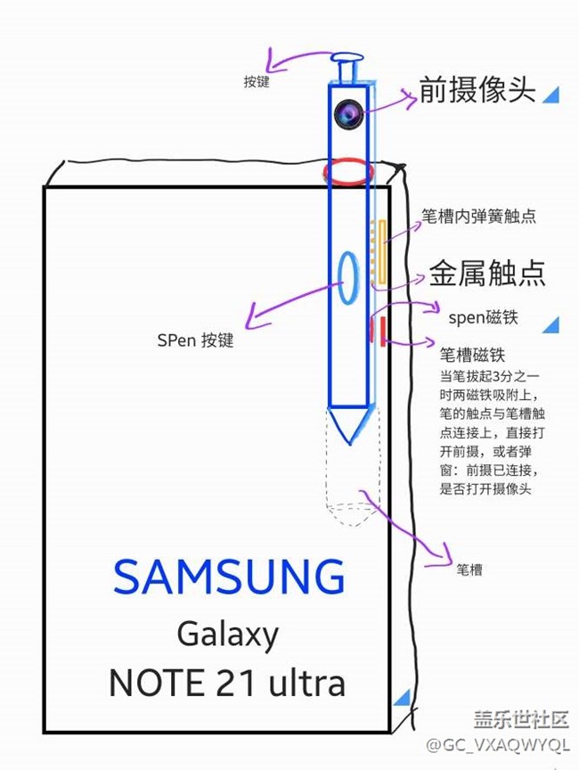 把前攝像頭裝在spen 上面,因為無線傳輸圖傳是不可能的,那就改為觸點吧[受虐滑稽]像數(shù)據(jù)線一樣就ok 了,把spen 拔出3分之一時,用汝磁鐵定位,有彈簧(類似于鑰匙插入鎖頭一樣)金屬銅觸點,讓手機與spen連接傳輸相機的數(shù)據(jù),就像U*攝像頭一樣[喵喵]也可以用于spen 充電,像手環(huán)充電一樣,磁吸附銅觸點,就可以把spen 的無線充電模塊去掉了[受虐滑稽]我覺得這個方案真的可以實現(xiàn)[笑哭]你覺得呢