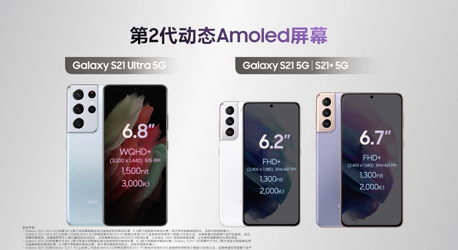 三星Galaxy S21系列采用了第2代動(dòng)態(tài)Amoled屏幕,Galaxy S21擁有6.2英寸屏幕、Galaxy S21+擁有6.7英寸屏幕、Galaxy S21 Ultra擁有6.8英寸屏幕。