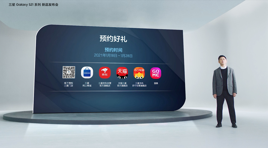 三星電子大中華區(qū)移動(dòng)通信部 副總裁 張際宏 上臺(tái)為大家?guī)砹祟A(yù)約好禮的活動(dòng),即日起至1月28日,您可通過三星門店、三星網(wǎng)上商城、三星京東自營官方旗艦店、天貓三星官方旗艦店、三星手機(jī)蘇寧自營旗艦店、國美多個(gè)渠道進(jìn)行預(yù)約,預(yù)約顧客在1月29日~2月9日購買Galaxy S21 Ultra 5G的用戶,即有機(jī)會(huì)獲贈(zèng)Galaxy Buds Pro;購買Galaxy S21+以及S21的用戶,有機(jī)會(huì)獲贈(zèng)價(jià)值650元的三星Galaxy Buds Pro 5折優(yōu)惠券或者價(jià)值500元的三星會(huì)員積分。